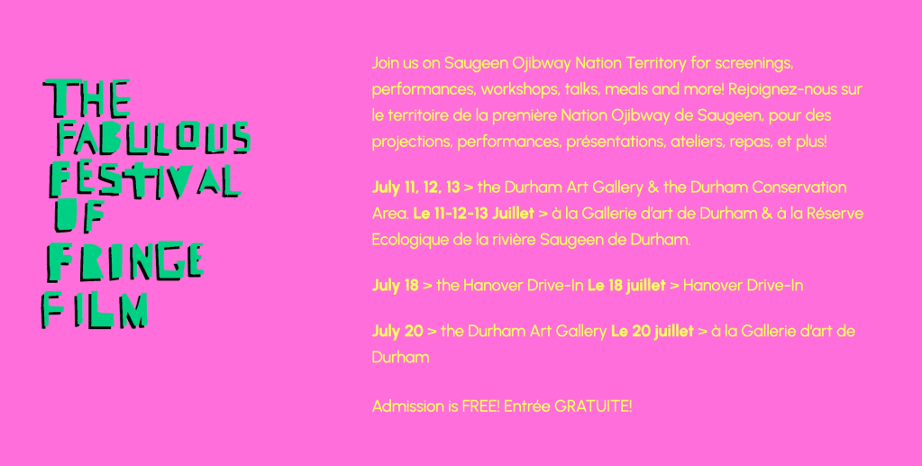 Programmers: Odeimin Runners Club, Wayne Dunkley, Candace Elder, Interference Ensemble, Jessica Karuhanga, Caroline Kilmek, Milada Kovacova, Zakide and the Wawasayg Film & Media Arts Festival