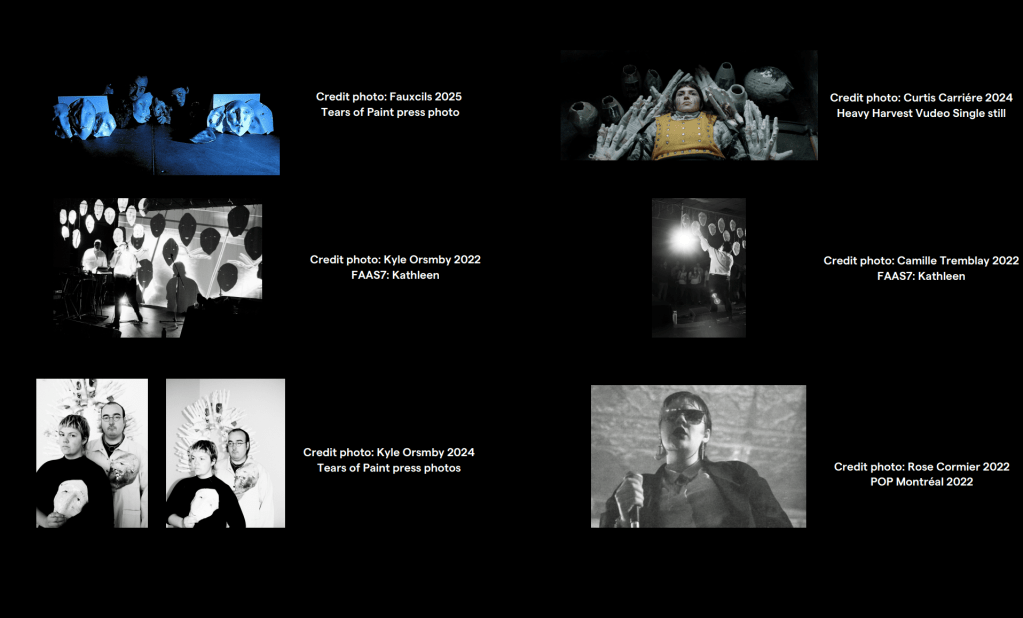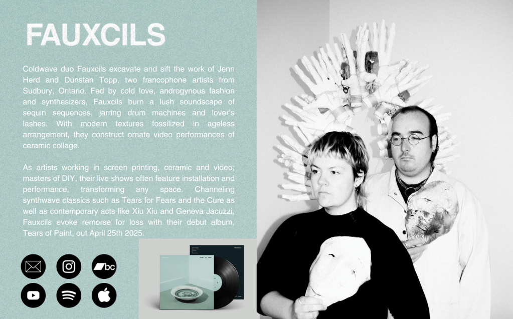 Artistes œuvrant dans la sérigraphie, la céramique et la vidéo, maîtres du bricolage, leurs performances en direct intègrent souvent installation et performance, transformant n’importe quel espace. Puisant dans les classiques du synthwave tels que Tears for Fears et The Cure, ainsi que dans des artistes contemporains comme Xiu Xiu et Geneva Jacuzzi, Fauxcils évoque le chagrin de la perte avec leur premier album, Tears of Paint, qui paraîtra le 25 avril 2025.