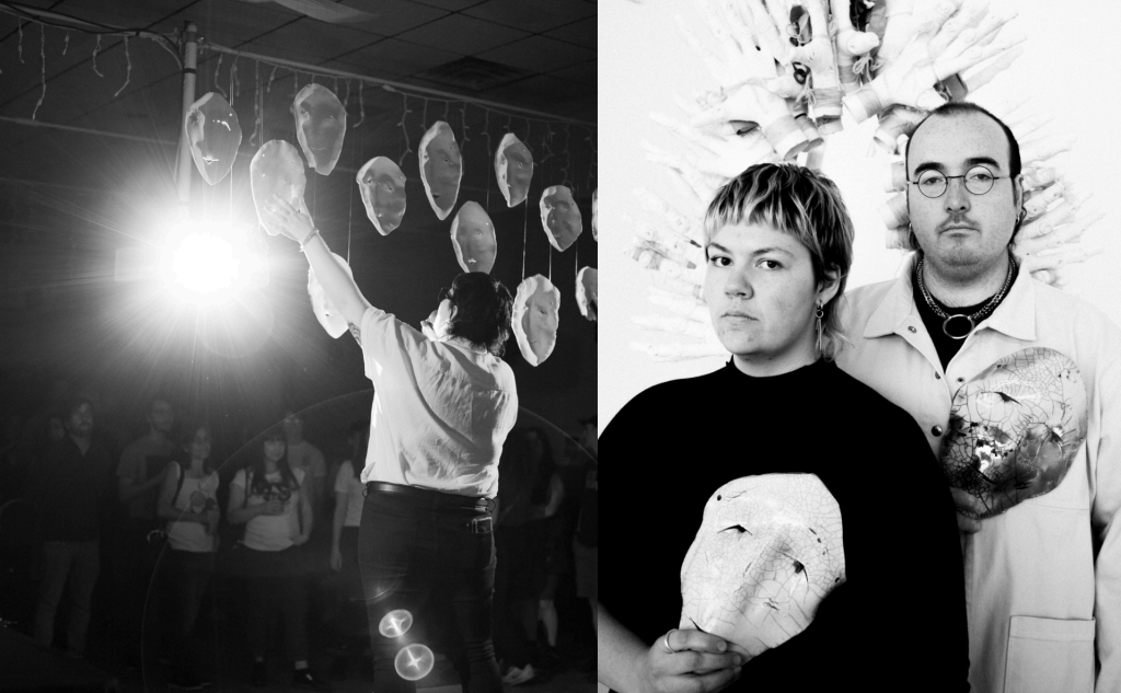 Le duo coldwave Fauxcils explore et tamise le travail de Jenn Herd et Dunstan Topp, deux artistes francophones originaires de Sudbury, en Ontario. Nourris par un amour froid, une mode androgyne et des synthétiseurs, Fauxcils embrasent un paysage sonore luxuriant de séquences à paillettes, de boîtes à rythmes percutantes et de battements de cils amoureux. Avec des textures modernes fossilisées dans une composition intemporelle, ils construisent des performances vidéo ornées de collages en céramique.