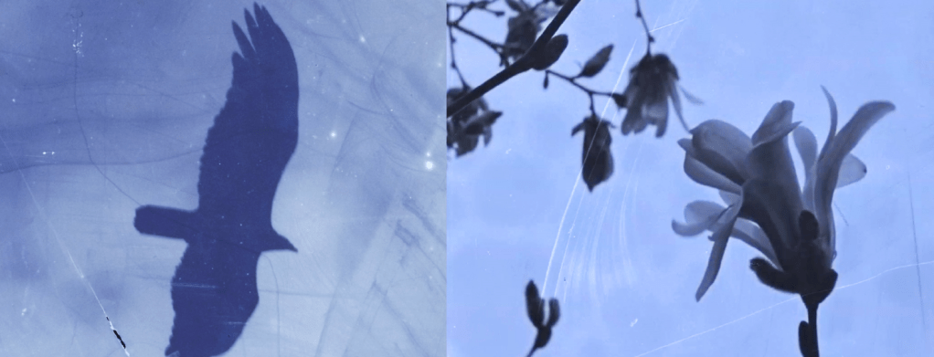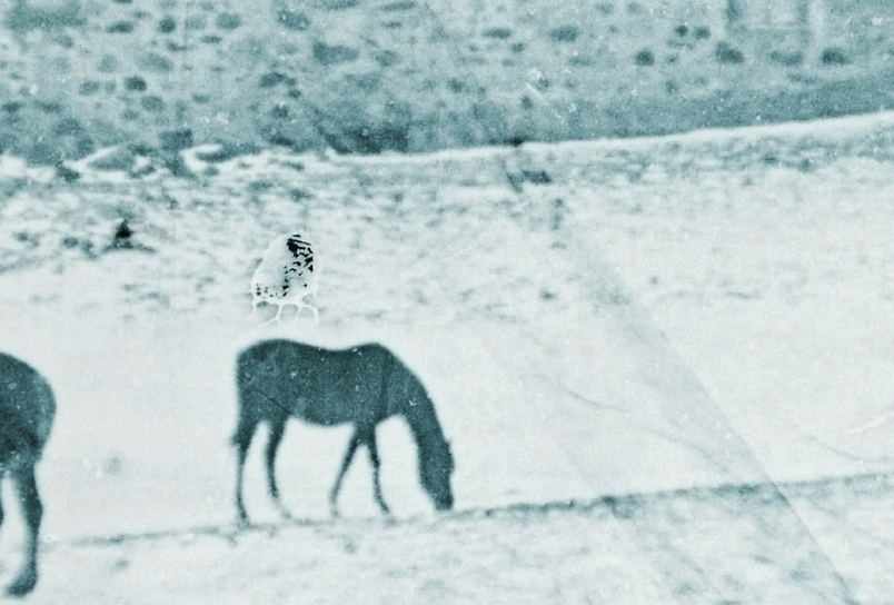 `vulture’ sets its sight on farm animals and their surrounding flora. Static shots and slow moving zooms, follow the grazing animals in their minute inter-species exchanges. When left to roam together the sensibilities of these “beasts” are allowed to surface. The film was shot and processed with various means including flower/plant processing carried out as blooming occurred, from 2016-18,. In some cases a salt bath was used for fixing the film which was left soaking in the dark for 3 days. Vultures hover over the barn, from high, with razor sharp eyesight, and a keen sense of smell. Together, they stalk and share their decaying sustenance. Intense acid in their stomach allows them to digest great quantities of their dead prey, without falling ill.